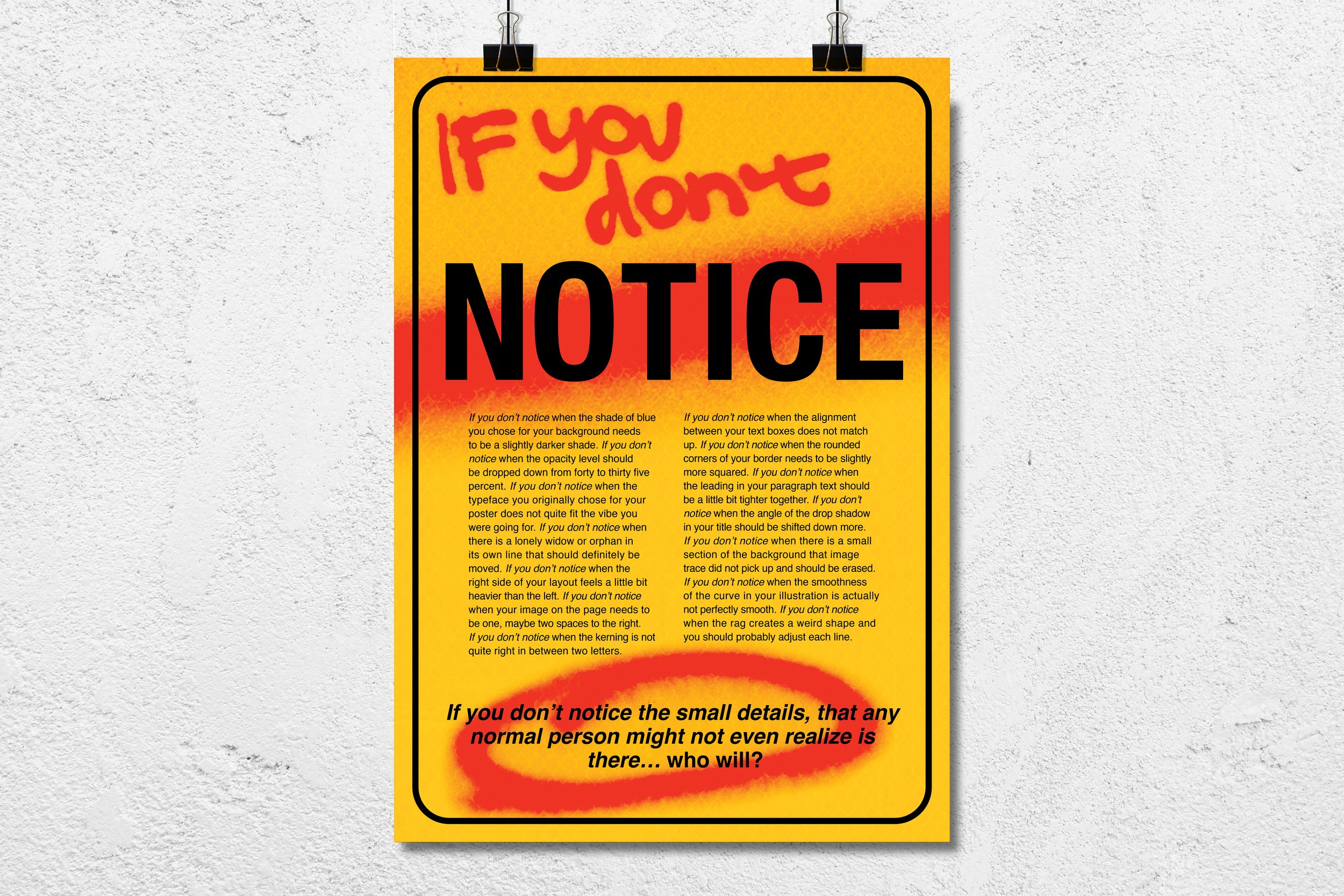 For the final poster, I wanted to really emphasize and dramatize the idea of “noticing.” I drew inspiration from a yellow warning sign and added a spray paint effect to give the design energy and texture. To make the spray paint look authentic, I actually used real spray paint to write the words and draw the circle by hand. This added a tactile, hand-crafted element that contrasts nicely with the bold, clean black type, while the bright red of the spray paint creates a striking, attention-grabbing focal point.
